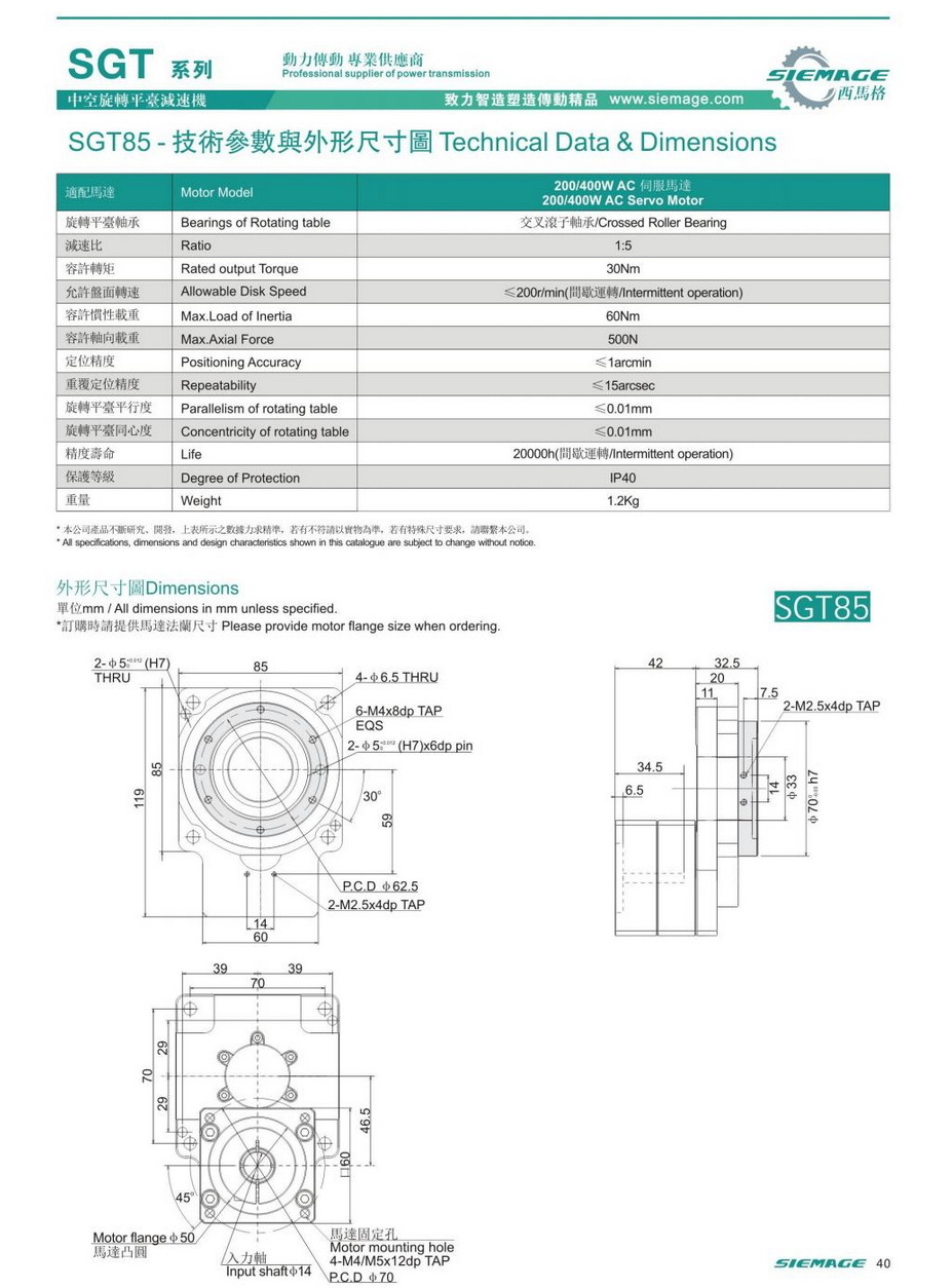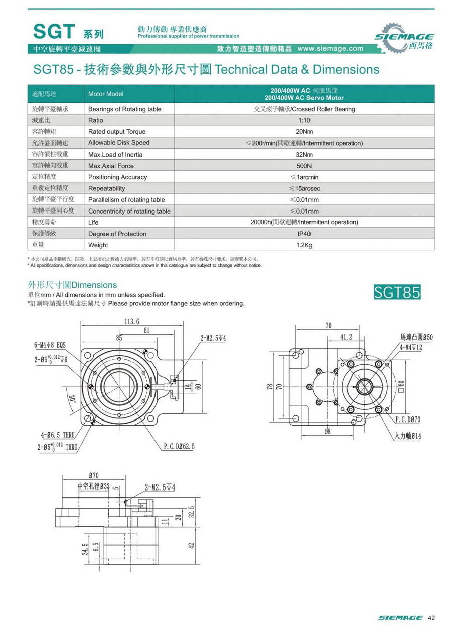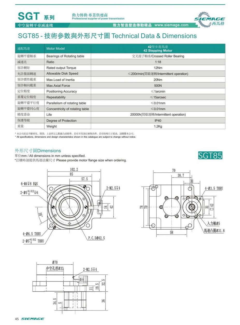 西馬格中空平臺SGT85,可配各品牌200/400W伺服電機,50/100W伺服馬達,各廠家42型步進馬達,57步進電機。減速比有1:5,1:10,1:18等。