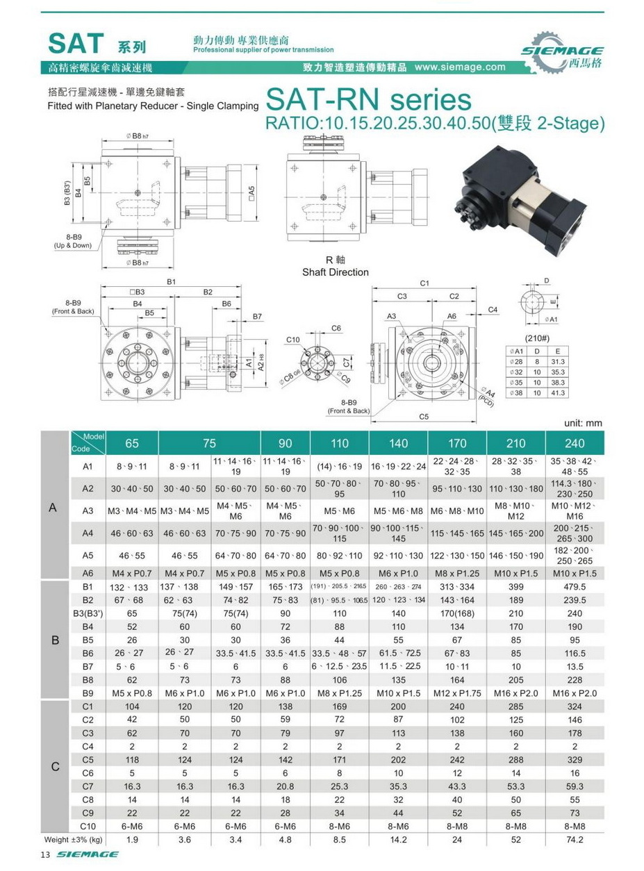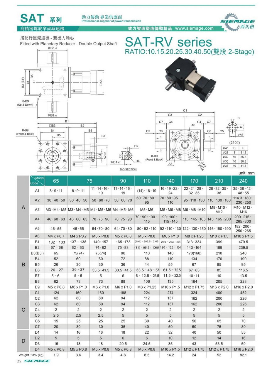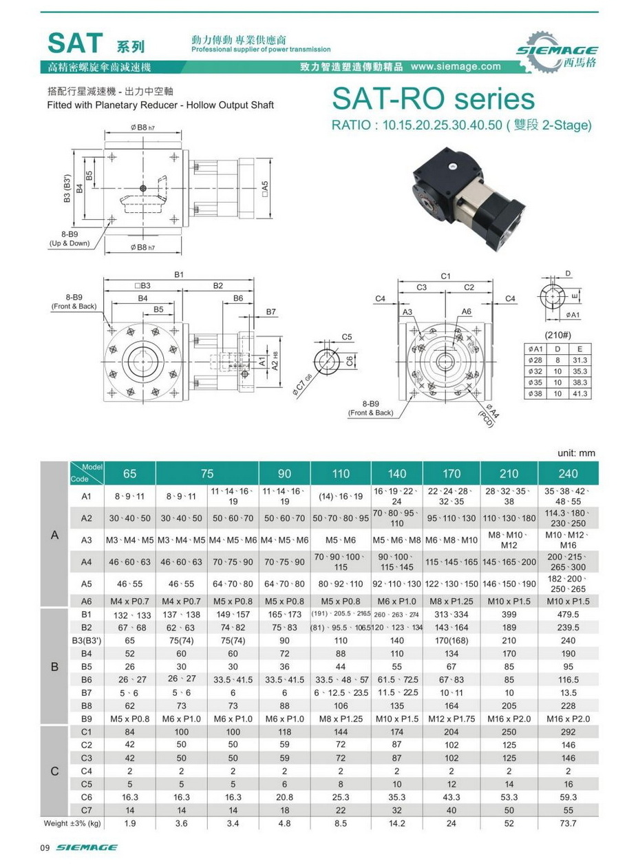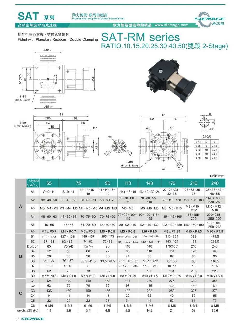 螺旋錐齒輪減速機雙級的型號有SAT65,SAT75,SAT90,SAT110,SAT140,SAT170,SAT210等,減速比有1:10,1:15,1:20,1:25,1:30,1:40,1:50等,入力可配各種伺服電機,步進電機,直流電機等。螺旋錐齒輪減速機雙級入力軸及出力軸均可特殊加工,訂制,滿足各種需求。