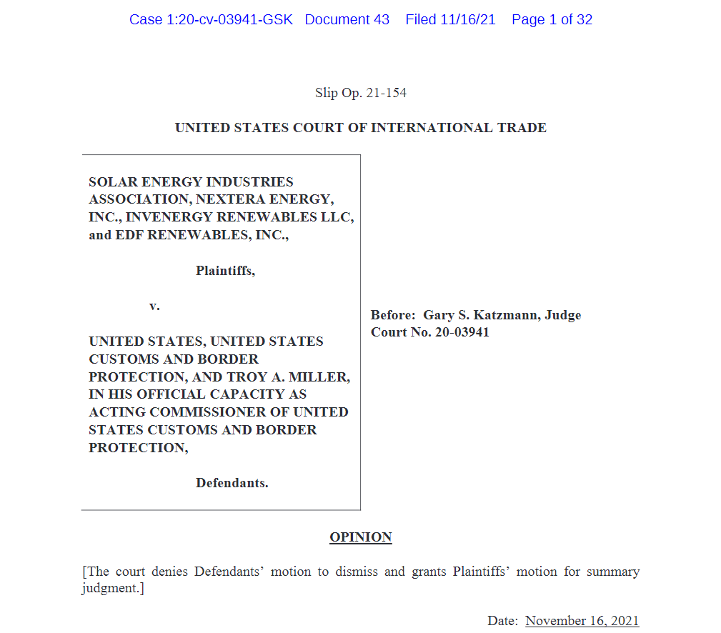 ? ? ? ?CIT表示,“此前的10101號(hào)公告撤銷了對(duì)雙面太陽(yáng)能電池板的關(guān)稅豁免權(quán),并增加了CSPV組件的保障責(zé)任,這既對(duì)法律條例的構(gòu)成了明顯的錯(cuò)誤曲解,同時(shí)還超出了總統(tǒng)授權(quán)的范圍。”